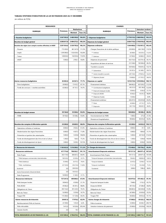 Version citoyenne du rapport du rapport d'exécution au 31 Décembre 2025 de la loi de finances 2025 Introduction Dans le cadre du pilotage du suivi de l’exécution de la loi...