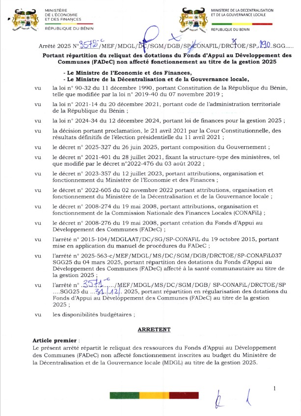 Arrêté 2025 N° 3572/MEF/MDGL/DC/SGM/DGB/SP-CONAFIL/DRCTOE/SP 190SGG