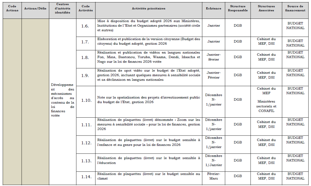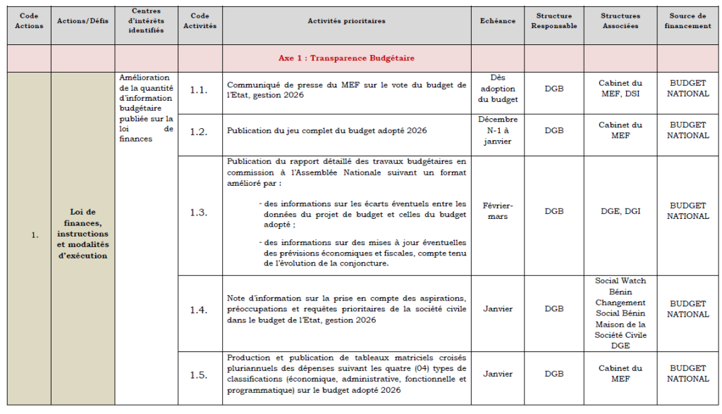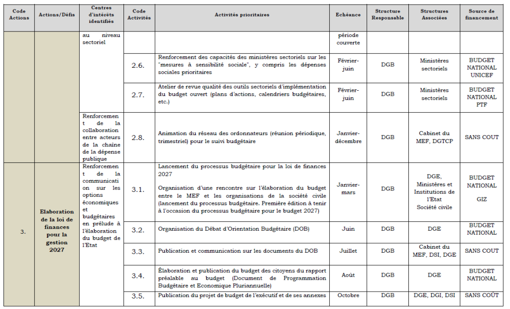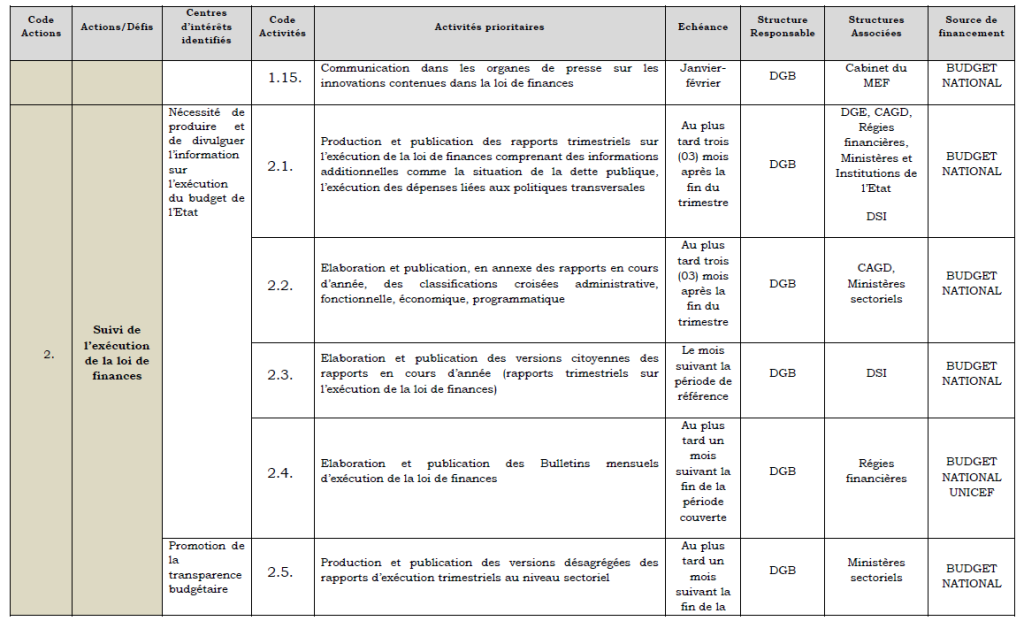 Plan d’actions consolide pour l’amélioration de la transparence budgétaire, de la participation publique et de la redevabilité.